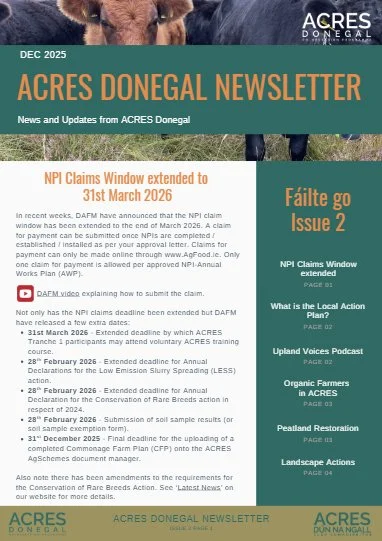 Issue 2 of the ACRES Donegal Newsletter covers important dates to remember from DAFM, an explanation of the Local Action Plan, what is means to be an organic farmer in ACRES, and a little information on peatland restoration and getting involved with landscape actions. We mention our new podcast too - Upland Voices - which you can listen to now on all podcast channel services.